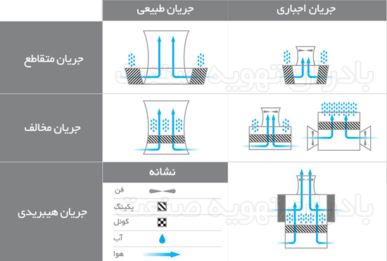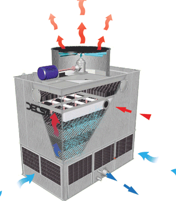 در این تصویر مشاهده میکنید که آب گرم از طریق لوله وارد دستگاه شده به روی پکینگ ها پاشیده می شود و همزمان هوا از ناحیه زیرین وارد شده و به سمت بالا حرکت می کند. آب به سمت پایین حرکت کرده و در اثر تماس آب با هوا مقداری از آب تبخیر شده و مابقی آب درون سیستم خنک می شود و از طریق لوله تشت دستگاه خارج می شود. هوا حامل بخار آب و گرما به وسیله فن از برج خنک کن خارج شده و به اتمسفر وارد می شود.